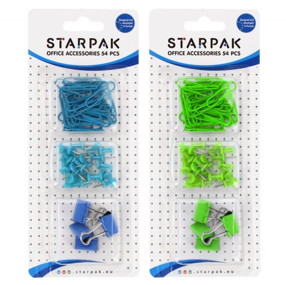 Na szczególną uwagę zasługują zestawy akcesoriów biurowych STARPAK. W każdym takim zestawie znajdują się spinacze, kołki tablicowe, gumki recepturki i klipsy w kolorze niebieskim lub zielonym.