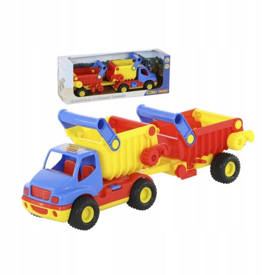 "Małych jak i dużych chłopców fascynują maszyny budowlane. Juz od najmłodszym lat tworzą swoje pierwsze budowle z klocków, piasku a nawet kamieni. Wykorzystują do tego dostępne na rynku zabawki, które są miniaturami prawdziwych pojazdów używanych przy pracach budowlanych bądź robotach drogowych. CONSTRUCK, WYWROTKA Z NACZEPĄ od firmy POLESIE WADER Quality Toys to pojazd idealny dla małego budowniczego. Może nim przetransportować wszystkie elementy niezbędne podczas budowy. Pojazd wyposażony jest w dodatkową przyczepę, którą można odłączyć w każdym momencie. Kontenery obu części są ruchome. Można je podnosić i obniżać za pomocą specjalnych uchwytów. Na końcu każdego z nich umieszczono specjalną klapę, którą można otwierać i zamykać. Zarówno wywrotka jak i jej przyczepa posiadają po cztery koła z gumowymi oponami. Są szerokie a ich bieżnik posiada chropowatą strukturę, dzięki której pojazdem można jeździć po różnych nawierzchniach. Gwarantuje to również stosunkowo cichą podróż na podłodze w domu. Każda z części posiada również rączkę umożliwiającą łatwe transportowanie samego pojazdu. Zabawka została wykonana z wysokiej jakości plastiku. To bardzo ważny aspekt gwarantujący trwałość oraz bezpieczeństwo jej użytkowania."