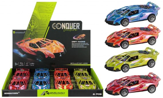 Zalety produktu: samochód posiada funkcję pull&back dzięki czemu po pchnięciu pojazdu do przodu kontynuuję jazdę samodzielnie, dodatkowe koło wprawia auto w drift Wspaniałe auto wyścigowe MEGA CREATIVE pozwoli dziecku przenieść się na tor wyścigowy i poczuć się jak w prawdziwej Formule 1. Weź udział w niezwykłym wyścigu Zawartość zestawu: samochód wyścigowy Drift. Całość wykonana z plastiku i gumy. Samochód występuje w czterech kolorach: czerwonym, niebieskim, pomarańczowym, zielonym. Uwaga produkt wysyłany losowo. Wymiary/waga/baterie: wymiary produktu dł. x wys. x gł. cm : 16x4x7, wymiary opakowania-display dł. x wys. x gł. cm : 36x4x35 ,waga produktu bez opakowania kg : 0,10 kg, waga produktu w opakowaniu kg :1,07kg, nie wymaga zasilania bateriami. Zabawka przeznaczona dla dzieci w wieku: 3 . Pakowana w display po 8szt. W kartonie zbiorczym po 160szt.