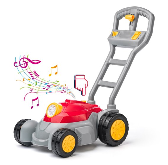 Aby rozpocząć zabawę, wystarczy wkręcić dołączony płyn do baniek w dolną część kosiarki i nacisnąć przycisk. Z przedniej części zabawki zacznie wydobywać się strumień kolorowych baniek. Ponowne naciśnięcie przycisku uruchamia dodatkowo muzykę, wzbogacając zabawę o efekt dźwiękowy. Dwa tryby działania pozwalają dopasować zabawę do nastroju dziecka.