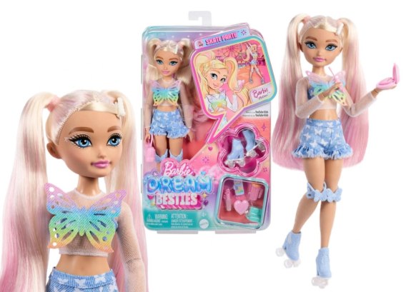 Lalki Barbie Dream Besties mają nowe hobby: jazdę na wrotkach Ta lalka Barbie „Malibu” w nowej stylizacji inspirowanej motylkami i z uroczymi wrotkami pragnie wyruszyć ku nowej przygodzie. Barbie „Malibu” marzy o własnej firmie kosmetycznej, więc zawsze ma ze sobą tematyczne akcesoria, takie jak „błyszczyk” czy lusterko. Lalka Barbie „Malibu” z długimi blond włosami, które można dowolnie stylizować, inspiruje dzieci w wieku od 4 lat do spełniania najskrytszych marzeń. Lalka nie stoi samodzielnie. Kolory i elementy dekoracyjne mogą się różnić.