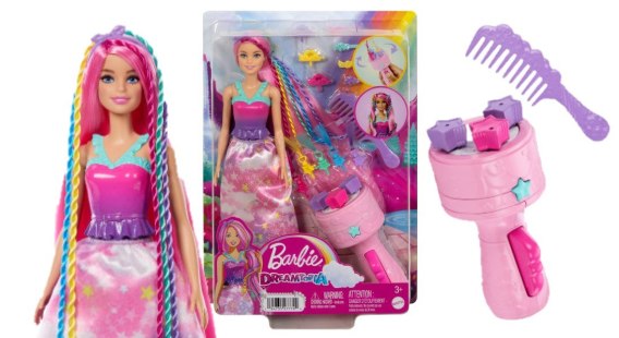 Barbie Dreamtopia Księżniczka Zakręcone pasemka Lalka z fantazyjnymi włosami do stylizacji przyrząd do zakręcania i i akcesoria Zabawa włosami Mali styliści mogą tworzyć bajkowe fryzury z lalką Barbie® Księżniczka Zakręcone pasemka. Wystarczy włożyć zaczepy pasemek do przyrządu i nacisnąć przycisk, by wyczarować różne zakręcone fryzury na bardzo długich, kolorowych włosach lalki. Barwne akcesoria urozmaicają zabawę. Lalka Barbie® nie stoi samodzielnie. Kolory i elementy dekoracyjne mogą się różnić. Mali styliści mogą tworzyć swoje wymarzone fryzury dzięki lalce Barbie™ Dreamtopia Zakręcone pasemka Śliczna lalka jest ubrana w dwukolorowy gorset i spódniczkę w gwiazdki. Wymyślaj nieskończone oryginalne fryzury Lalka Barbie® ma bardzo długie włosy 21,5 cm o fantazyjnym odcieniu i tęczowe pasemka wzbogacające zabawę w układanie fryzur. Rozczesz włosy Barbie®, a potem umieść dwa lub trzy zaczepy pasemek w specjalnym przyrządzie do stylizacji i twórz fantastyczne fryzury jednym naciśnięciem przycisku.Gdy skończysz układać fryzurę, wykorzystaj klipsy, aby trzymała się na miejscu. Możesz powtarzać tę magiczną zabawę wciąż od nowa – możliwości są nieograniczone. Uzupełnij wygląd lalki Barbie® kolorowymi spinkami, a potem ruszaj ku magicznym przygodom.
