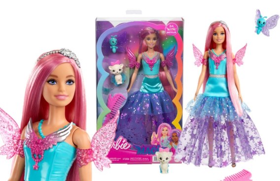 Barbie A Touch of Magic Szczypta Magii Lalka Barbie „Malibu” z długimi włosami 17,5 cm w bajkowej stylizacji 2 figurki zwierzątek i akcesoria Ta lalka Barbie® jest wprost magiczna dzięki długim włosom i błyszczącej baśniowej sukience Lalka Barbie® „Malibu” Roberts ma na sobie błyszczący strój inspirowany jej ekranową stylizacją. Fantastyczną zabawę uzupełniają dwa zwierzątka i akcesoria do stylizacji. Lalka nie stoi samodzielnie. Kolory i elementy dekoracyjne mogą się różnić. Lalka Barbie® „Malibu” Roberts inspirowana bajką „Barbie: Szczypta magii” ma na sobie baśniowy strój, a w zestawie są też dwie figurki zwierzątek i akcesoria. Z tą lalką Barbie® zabawa w układanie fryzur nabiera magii. Zachwyć się pasteloworóżowymi włosami o długości 17,5 cm, które możesz stylizować za pomocą dołączonych akcesoriów: grzebienia, błyszczącej opaski i ozdobnej spinki. Barbie® „Malibu” jest ubrana w sukienkę składającą się z kilku warstw wykończoną detalami skrzydełek przy dekolcie. Długa tiulowa spódnica mieni się gwiazdkami, a brokatowe skrzydełka na ramionach nadają stylizacji magii. Zwierzątka też wyglądają fantastycznie. Są tu uroczy motylek i kotek w ślicznym tutu.