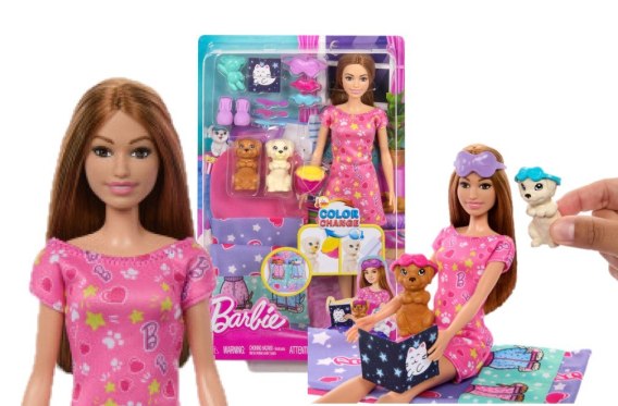 Barbie Piżama party z pieskami Zestaw z lalką Barbie, 2 figurkami piesków, zmianą koloru i ponad 10 akcesoriami, w tym śpiworem i opaskami na oczy, Barbie® szykuje się na piżama party z pieskami W tym zestawie znajdziesz lalkę Barbie®, dwa urocze psiaki, śpiwór z miejscem dla całej trójki przyjaciół i 10 akcesoriów. Odkryj niesamowitą zmianę koloru: użyj zimnej i ciepłej wody, aby zmienić pyszczek szczeniaczka z czystego w „brudny” i odwrotnie. Barbie® jest gotowa na zabawę w domu, ubrana w koszulę nocną i kapcie. Wszyscy mają opaski na oczy, by śniło im się niezwykle słodko. Lalka nie stoi samodzielnie. Kolory i elementy dekoracyjne mogą się różnić.
