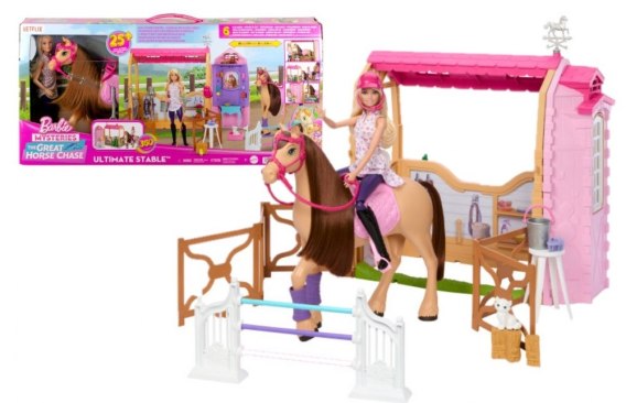 Barbie Stadnina Marzeń Zestaw filmowy z lalką, figurką konika i akcesoriami; ponad 25 elementów i 6 obszarów zabawy; inspirowany serialem „Barbie Mysteries: The Great Horse Chase – Zagadki Barbie: Wielki pościg” Inspirowany serialem „Barbie Mysteries: The Great Horse Chase – Zagadki Barbie: Wielki pościg” zestaw zabawka dla dzieci Stadnina Marzeń z ponad 25 elementami zaprasza do fantastycznej zabawy Dzięki sześciu obszarom zabawy możesz wraz z lalką Barbie® „karmić” konika pysznymi „warzywami” na stanowisku do karmienia, czyścić go i szczotkować w obszarze do pielęgnacji, trenować skoki przy płotku, zawieszać wstążeczki lub wymieniać zdjęcia na ścianie zwycięzców oraz krzątać się w ogródku pełnym róż. Zestaw dla dzieci można łatwo złożyć, co ułatwia przechowywanie. Lalka nie stoi samodzielnie. Kolory i elementy dekoracyjne mogą się różnić. Zestaw Barbie® Stadnina Marzeń jest inspirowany serialem „Barbie Mysteries: The Great Horse Chase – Zagadki Barbie: Wielki pościg”. Dzięki ponad 25 elementom i 6 obszarom zabawy możesz przeżywać tu niekończące się przygody. Jeśli chcesz zaopiekować się konikiem, możesz wraz z lalką Barbie® „karmić” go pysznymi „warzywami” na stanowisku do „karmienia” lub czyścić go i szczotkować w obszarze do pielęgnacji. Jest tu też płotek do skoków, przy którym Barbie® i konik mogą trenować Gdy zdobędą pierwsze miejsce, na ścianie zwycięzców można powiesić wstążeczki oraz wymieniać zdjęcia. Możesz też posprzątać w stajni dzięki akcesoriom takim jak grabie, łopata i siano, albo popracować w ogródku pełnym róż. Lalka Barbie® zgina się w kolanach, aby zabawa imitująca jazdę konną była jeszcze bardziej realistyczna. Zabawka koń Barbie® zachwyca długą, miękką grzywą i ogonem do czesania i stylizacji.