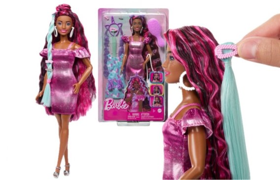 Kolekcja Barbie® Zabawa włosami zawiera urocze lalki o kolorowych fryzurach i zjawiskowych strojach. Każda lalka ma bardzo długie włosy 21,5 cm oraz 10 akcesoriów do układania fryzur i stylizacji. Dzieci pokochają tworzenie różnych fryzur i nieskończone możliwości łączenia strojów Lalki są sprzedawane oddzielnie, zależnie od dostępności. Lalki nie stoją samodzielnie. Kolory i elementy dekoracyjne mogą się różnić. W kolekcji Barbie® Zabawa włosami znajdziesz supermodne lalki o kolorowych fryzurach. A dzięki 10 akcesoriom do układania fryzur i stylizacji kreatywne możliwości są nieograniczone. Lalka Barbie® ma bardzo długie włosy 21,5 cm z kolorowymi akcentami. Jest ubrana w błyszczącą różową sukienkę mini, białe kolczyki i srebrzyste buciki z paskami. Totalna transformacja jest taka prosta dzięki ubrankom i akcesoriom do dowolnego łączenia. W zestawie jest też dodatkowa sukienka w jednorożce, druga para bucików na obcasie i torebka. Wśród akcesoriów do włosów są opaska z rogiem jednorożca i kosmykami włosów, spinka z pasemkiem włosów, dwie spinki, opaska z koczkami i zestaw gumek do włosów. Gdy już stworzysz wspaniałą fryzurę, możesz za pomocą szczotki rozczesać włosy Barbie® i zacząć zabawę od nowa. Możliwości są nieograniczone: od uroczych upięć po wymyślne warkocze.