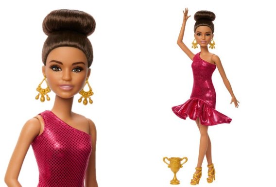 Barbie Tancerka Lalka modowa z brązowymi włosami upiętymi w kok, w czerwonej sukience z falbanką i bucikach do tańca trofeum, zabawka dla dzieci. Wkrocz na parkiet z lalką Barbie Tancerką, by triumfować na tanecznych scenach w rytmie fokstrota lub tanga. Ta lalka ubrana w błyszczącą czerwoną sukienkę z falbanką, złociste buciki na obcasie z paskiem i złociste kolczyki jest gotowa wytańczyć zwycięstwo w turnieju. Wygląd mistrzyni dopełniają spięte w kok włosy. Z dołączonym do zestawu trofeum możesz pozwolić swojej wyobraźni znaleźć się w centrum zainteresowania i zająć pierwsze miejsce Lalki nie stoją i nie tańczą samodzielnie. Kolory i elementy dekoracyjne mogą się różnić.