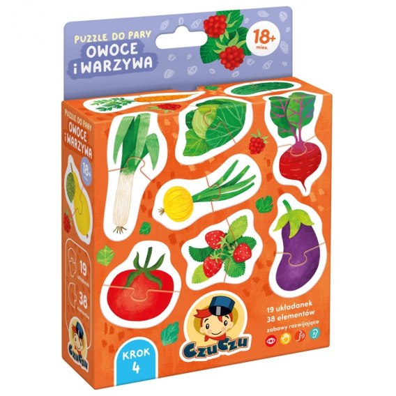 Edukacyjne puzzle to piękny i mądry prezent dla ciekawego świata malucha. Duże i wytrzymałe elementy są dopasowane do małych rączek, a soczyście kolorowe ilustracje zainspirują dzieci do zabawy i poznawania owoców i warzyw. Układanie to świetny sposób na to, by ćwiczyć sprawność dłoni, bystre oko i wyobraźnię. Tematyka puzzli zachęca do rozmów o zdrowym żywieniu i wspólnego gotowania.