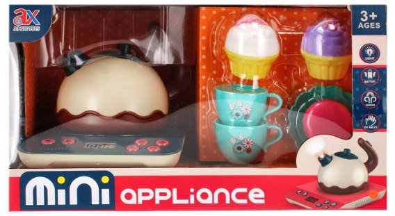 Zalety produktu: czajnik posiada efekty dźwiękowe oraz świetlne- gotowanie wody, wesoła melodia, niebieska lampka, do czajnika dołączona jest kuchenka z płytą grzewczą, płyta posiada efekty dźwiekowe oraz świetlne, przyciski którymi można ustawić programy gotowania, przyciski" & 39;& 39; i "-" którymi można imitować podnoszenie lub obniżanie temperatury grzania. Czajnik elektryczny MEGA CREATIVE to niezbędny sprzęt w każdym domu Zawartość zestawu: czajnik, płyta grzewcza, 2 x filiżanki, talerzyk, 3 x babeczki. Całość wykonana z plastiku. Wymiary/waga/baterie: wymiary produktu dł. x wys. x gł. cm : czajnik-12x11x10, płyta-14x3x18. Wymiary opakowania dł. x wys. x gł. cm : 33x19x19, waga produktu bez opakowania kg : 0,30 kg, waga produktu w opakowaniu kg : 0,57 kg. Wymaga zasilania bateriami płyta- 3 x AALR6- nie załączono do zestawu, czajnik-2 x AALR06- nie załączono do zestawu. Zabawka przeznaczona dla dzieci w wieku: 3 . Pakowana w kartonik z okienkiem. W kartonie zbiorczym po 12 szt.