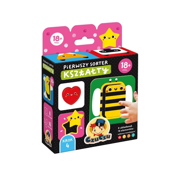 Pierwszy sorter KSZTAŁTY od CzuCzu to świetny pomysł na pierwsze trudniejsze układanki i sorter kształtów dla półtorarocznych dzieci. Pokaż dziecku, jak dokładać elementy. Możesz najpierw to zrobić jego rączkami. Wskazuj i nazywaj kształty, kolory, opowiadaj o tym, co widać na ilustracjach. To świetny pomysł na poznawanie i utrwalanie nowych słów i to, by krok po kroku rozwijać sprawność dłoni, spostrzegawczość i razem poznawać świat.