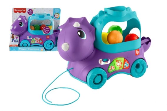 Wybierz się na wesoły spacer z tą zabawką Dinuś Podskakujące piłeczki od Fisher-Price®. Wielbiciele dinozaurów mogą popychać lub ciągnąć przyjaznego triceratopsa, aby zobaczyć, jak kolorowe piłeczki podskakują w środku zabawki. Aby zabawa była bardziej angażująca, dzieci mogą naciskać 3 przyciski, aby aktywować edukacyjne treści uczące literek, liczenia, kolorów i kształtów. Naciśnij przycisk globusa, aby wybrać język: polski, węgierski, czeski, słowacki lub angielski. · Interaktywny zabawkowy dinozaur do ciągnięcia z podskakującymi piłeczkami, światełkami oraz ponad 40 aktywacjami piosenki, dźwięki i wypowiedzi · Mali wielbiciele dinozaurów mogą popychać lub ciągnąć triceratopsa, aby zobaczyć podskakujące kolorowe piłeczki oraz aktywowane ruchem światełka i dźwięki · 3 poziomy nauki wprowadzają malucha w świat literek, liczenia, kolorów i kształtów. Naciśnij przycisk globusa, aby wybrać język: polski, węgierski, czeski, słowacki lub angielski · W zestawie są 4 piłeczki do chwytania i wrzucania do zabawki · Pomaga dzieciom od 12 do 36 miesiąca wzmacniać zręczność i sprawność ruchową