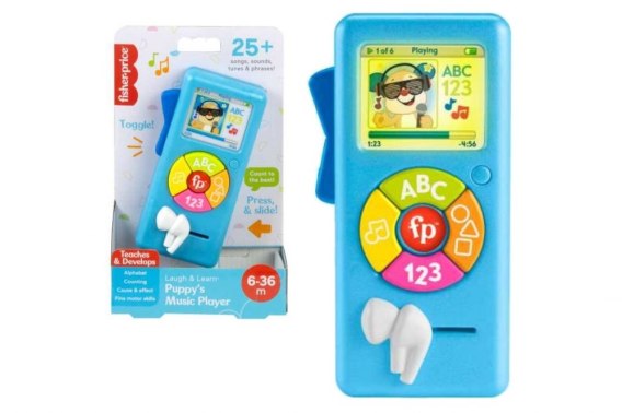 Z Odtwarzaczem muzycznym 123 „Ucz się i śmiej ” od Fisher-Price® maluch może zabrać muzyczną zabawę edukacyjną, gdziekolwiek chce. Ta przenośna zabawka wygląda jak odtwarzacz mp3 i ma mnóstwo doskonałej zabawy: podświetlany ekran ze Szczeniaczkiem, piosenki edukacyjne do wspólnego śpiewania w 5 stylach oraz elementy aktywizujące pomagające ćwiczyć zręczność. Twoje dziecko będzie zachwycone, że może Cię naśladować dzięki temu interaktywnemu zabawkowemu odtwarzaczowi muzycznemu. Naciśnij przycisk globusa, aby wybrać język: polski, węgierski, czeski, słowacki lub angielski.Ten zabawkowy interaktywny odtwarzacz muzyczny wygląda jak prawdziwy dzięki 4 przyciskom, podświetlanemu ekranowi i edukacyjnym piosenkom.Naciskaj przyciski, aby aktywować światełka i ponad 25 dźwiękowych aktywacji dźwięków, wypowiedzi i piosenek o literkach i cyferkach. Naciśnij przycisk globusa, aby wybrać język: polski, węgierski, czeski, słowacki lub angielski .Aż 5 gatunków muzycznych Przesuń „słuchawki”, aby usłyszeć więcej dźwięków i melodii.Przełącznik z boku pozwala małym rączkom ćwiczyć zręczność.