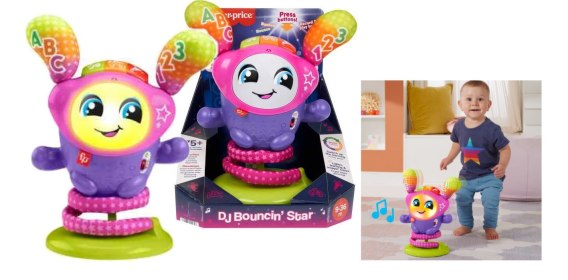 Fisher-Price Poziomy Nauki Taneczna gwiazda DJ Zabawka interaktywna POLSKA wersja językowa, ze światełkami, muzyką i kołysaniem Rozkręć imprezę pełną nauki w tanecznym rytmie z muzyczną zabawką edukacyjną od Fisher-Price® Gdy dziecko naciska przyciski, interaktywna Taneczna gwiazda „ożywa” dzięki kolorowym światełkom i ponad 75 dźwiękowym aktywacjom, na które składają się odgłosy, melodie, piosenki i wypowiedzi wprowadzające malucha w świat literek, liczenia, kolorów i nie tylko. Ta muzyczna zabawka ma specjalną miękką sprężynę – DJ wesoło podskakuje, zapraszając do aktywnej zabawy Dzięki 3 Poziomom Nauki ta Taneczna gwiazda zachęca szkraby do tańca, skakania i wesołej nauki.Interaktywna muzyczna zabawka edukacyjna na miękkiej sprężynie rusza się podczas zabawy – Taneczna gwiazda DJ wesoło podskakuje w rytm radosnej muzyki 3 Poziomy Nauki wprowadzają malucha w świat literek, kolorów i liczenia od 1 do 10 – a to wszystko po polsku. Naciskaj edukacyjny i muzyczny przycisk, aby włączać ponad 75 dźwiękowych aktywacji: piosenki, dźwięki, wypowiedzi, kolorowe światełka i ruchy Nagrywanie i odtwarzanie: Taneczna gwiazda DJ ma też funkcję nagrywania – naciśnij przycisk mikrofonu i powiedz coś, a ona to powtórzy, przerabiając na krótką zabawną piosenkę