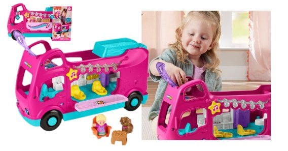 Fisher-Price Little People Barbie Wymarzony kamper Światła i dźwięki Zestaw z pojazdem ze światełkami i dźwiękami oraz 2 figurkami, interaktywna zabawka samochód dla dzieci od 18 miesiąca życia Mali fani Barbie® mogą wyruszyć w drogę ku przygodzie w uroczym Wymarzonym kamperze Barbie® od Little People®. Ta interaktywna zabawka w kształcie kampera zawiera 2 figurki Little People® i 3 elementy do zabawy z motywem biwakowym, które urozmaicają zabawę. Poszukiwacze przygód mogą pojechać na „pole namiotowe” i zacząć zabawę ze światełkami i dźwiękami, które można aktywować naciśnięciem figurki na miejscu kierowcy lub przycisku gwiazdki. Urocza zabawka samochód-kamper z klasycznym wyposażeniem zabierze dzieci w wielogodzinną podróż do krainy wyobraźni. Maluchy mogą wyruszyć na kempingowe przygody z tym pojazdem do popychania, który po otwarciu odsłania interaktywny zestaw do zabawy Little People®. Naciskaj przycisk gwiazdki lub siedzenie kierowcy, aby aktywować wesołe światełka i dźwięki Odkryj aktywizujące elementy: Dach zamienia się w zjeżdżalnię i basen, boczne drzwi po otwarciu stają się tarasem, miejsce do spania i lodówka też się otwierają, a figurki mieszczą się na fotelach i toalecie