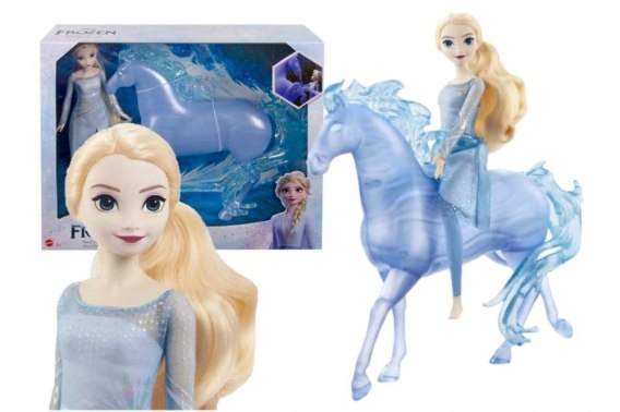Inspirowane epicką przygodą z filmu „Kraina Lodu 2” Disneya lalka Elsa i figurka Nokka są gotowe na magiczne przygody poza granicami Arendelle. Ta lalka Elsa ma zginane kolana, aby mogła dosiadać konia, oraz swój kultowy jasnoniebieski strój z filmu. Mityczny duch wody Nokk o kształcie konia mieni się odcieniami mroźnego niebieskiego. Lalka nie stoi samodzielnie. Kolory i elementy dekoracyjne mogą się różnić.Ta lalka Elsa i figurka ducha wody Nokka są inspirowane uwielbianymi bohaterami filmu animowanego „Kraina Lodu 2” Disneya.Lalka Elsa ma zginane kolana, aby mogła dosiadać Nokka, oraz kultową stylizację z drugiego filmu.Figurka mitycznego ducha wody Nokka zachwyca błyszczącymi detalami i jest gotowa pogalopować ku przygodom w Zaczarowanym Lesie.Elsa ma długie blond włosy do zabawy w czesanie i stylizację fryzur.