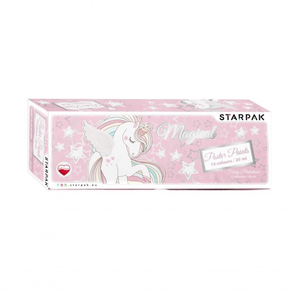 Zalety produktu: Farby plakatowe w 12 intensywnych kolorach rozwijające kreatywność małych twórców. Dzięki optymalnej konsystencji farby dokładnie pokrywają malowaną powierzchnię i mają długi okres trwałości. Piękna szata graficzna inspiruje małych malarzy. Każdy kolor farby jest zamknięty w oddzielnym 20 ml zakręcanym pojemniczku, a całość w kartonowym pudełku zdobionym inspirującą grafiką z Unicorn, co ułatwia przechowywanie farb. Farby plakatowe są produkowane w Polsce. Wymiary/waga: Wymiary produktu szer. x wys.x gł. cm : 3x4x3, Wymiary opakowania szer. x wys. x gł. cm : 23x4x8, Waga produktu kg : 0,04 kg, Waga opakowania kg : 0,50 kg. Nie odpowiednie dla dzieci poniżej 3 lat. Pakowane w otwierany kartonik. Pakowane iner 6szt. Karton 24szt.