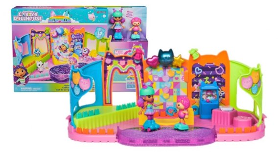 Wejdź do magicznego świata Gabby& 39;s Dollhouse z zestawem do zabawy Gabby& 39;s Party Room. Ten zestaw zawiera ekskluzywne 10-centymetrowe figurki Skater Gabby i Skater Marty, kotka na imprezie z działającymi wrotkami. Udekoruj Party Room akcesoriami i meblami do domku dla lalek, a następnie ciesz się zabawą sensoryczną z fidget toys na ścianie Party Room. Dla jeszcze większej zabawy, dołącz Party Room do Gabby& 39;s Dollhouse, aby podnieść domek do wysokości czterech pięter i dostać się do Party Room za pomocą domkowego "kociego-windatora". Zabawki Gabby& 39;s Dollhouse dla dziewczynek i chłopców są doskonałymi prezentami dla dzieci, które są fanami popularnego serialu Netflix i lubią budować światy domków dla lalek w ramach udawanej zabawy. Uczyń ich wejście do zabawy w domek dla lalek niezapomnianym dzięki światu uroczych figur, akcesoriów i mebli do domku dla lalek do zbierania i konfiguracji. Buduj swój świat dzięki niezbędnym elementom zestawu domku, takim jak kuchnia do zabawy lub pokój muzyczny, oraz mnóstwu kolekcjonerskich przedmiotów, takich jak niesamowita zabawka statek wycieczkowy, basen w stylu syrenki i zupełnie nowy zestaw do zabawy Party Room — poddasze domku z wewnętrznym skateparkiem i super uroczymi balkonami z mini zabawkami sensorycznymi, które zapewniają satysfakcjonującą zabawę sensoryczną i współpracują bezproblemowo z obiema wersjami domku dla lalek.