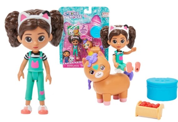 Wyrusz na kolejną ekscytującą przygodę z Gabi i sympatycznym Kiro. Ten zabawny zestaw zabawek zawiera kolekcjonerską figurkę Gabi o wysokości 10 cm, ubraną w urocze zielone ogrodniczki i noszącą charakterystyczną opaskę z kocimi uszami, podczas gdy Kicirożec Kiro ma fioletowe włosy, tęczowy róg jednorożca i super uroczą pamiątkę przedstawiającą Kira i Kiciusia Pandusia. Kiro ma również sprężynowe nogi, dzięki czemu można go nacisnąć, a następnie puścić, aby zobaczyć, jak Kiro podskakuje w górę iw dół. Następnie, podobnie jak Gabi w serialu, rozpakuj specjalną Kocią Przesyłkę, aby odkryć sekretną zabawkę, balię pysznych jabłek, którą Gabi może dać Kiro, gdy nadejdzie czas na przekąskę. Aby uzyskać ostatnią niespodziankę, zeskanuj kod QR wewnątrz Kociej Przesyłki, aby odblokować specjalną nagrodę w bezpłatnej aplikacji Koci Domek Gabi dostępnej na iOS i Androida . Pluszaki, lalki, figurki i zestawy do zabawy z serii Koci Domek Gabi to idealne zabawki dla dziewczynek i chłopców, którzy uwielbiają wykorzystywać swoją wyobraźnię do tworzenia własnego świata domków dla lalek, więc przygotuj się na niekończące się przygody z zestawem figurek Gabi i Kiciorożca Kiro.