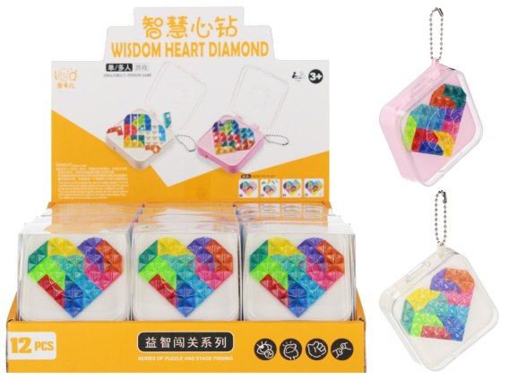 Zalety produktu: Gra logiczna Serce od MEGA CREATIVE. Zanurz się w fascynujący świat łamigłówek z grą logiczną Serce idealnym wyborem dla miłośników wyzwań umysłowych i eleganckiego designu Ta unikalna gra, w kształcie serca, łączy w sobie piękno formy z rozwijającą treścią, dostarczając satysfakcji zarówno dzieciom, jak i dorosłym. Wciągająca łamigłówka: -gra polega na dopasowaniu elementów lub odnalezieniu ukrytego rozwiązania, co rozwija logiczne myślenie i cierpliwość, doskonała do ćwiczenia koncentracji, spostrzegawczości i umiejętności analitycznych, odpowiednia dla dzieci od 3 roku życia oraz dla dorosłych, świetna do zabawy w pojedynkę oraz z rodziną, wykonana z bezpiecznego materiału, sercowaty kształt przyciąga uwagę tej gry. Zawartość zestawu: gra Serce, instrukcja z zasadami gry. Zabawka występuje w dwóch kolorach. Pakowana w przezroczystym etui w display po 12szt. Wymiary/waga: wymiary produktu szer. x wys. x gł. cm 7x3x7, waga produktu kg 0,04kg, wymiary produktu z opakowaniem szer. x wys. x gł. cm 8x10x6, waga produktu z opakowaniem kg. 0,06kg. Wymiary display szer. x wys. x gł. cm 24x10x25, waga display kg. 0,83kg. Przeznaczona dla dzieci w wieku 3 . Zabawka pakowana w display A 12. W kartonie 144/288szt.