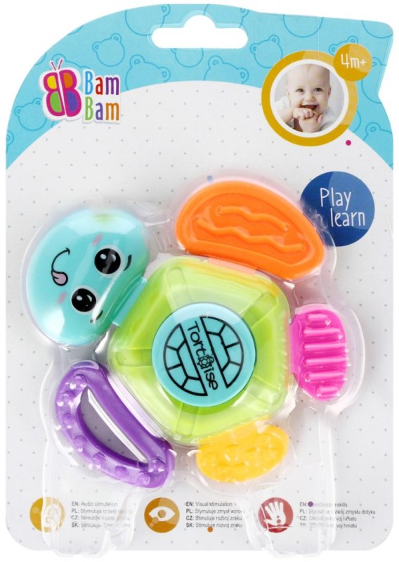 Kolorowa Grzechotka Żółwik BAM BAM przeznaczona dla niemowląt od 3 miesiąca życia. W intensywnej kolorystyce, o zróżnicowanej fakturze materiałów i róznorodnej formie wypustek na płetwach zachęcająca malucha do zabawy, jednocześnie stymulując rozwój zdolności manualnych oraz zmysłów dotyku, wzroku, słuchu oraz zdolności motorycznych. INteraktywny przycisk, wyzwalajacy dzwięk, stanowis dodatkową atrakcjję aktywizującą zmysł słuchu. Grzechotka, dzieki miękkim silikonowym płetwom, może być takze doskonałym remedium w okresie ząbkowania, przynosząc ulgę obolałym dziąsłom maluszka. Wymiary/waga/baterie: wymiary produktu dł. x wys. gł. cm : 12x5x12, wymiary opakowania dł. x wys. x gł. cm : 15x21x5, waga produktu bez opakowania kg : 0,07 kg, waga produktu w opakowaniu kg : 0,09 kg, nie wymaga zasilania bateriami. Zabawka pakowana na blistrze.