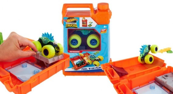 Hot Wheels Monster Trucks „Tankuj i jedź” Zabawkowy kanister przekształcający się w zestaw kaskaderski, z pojazdem Motosaurus w skali 1:64 i 2 autkami do „zgniatania” Zestaw Hot Wheels® Monster Trucks® „Tankuj i jedź” to mnóstwo rajdowej zabawy Ma kształt kanistra z okienkiem, przez które widać dołączony pojazd Hot Wheels® Monster Trucks® Motosaurus w skali 1:64. Otwórz kanister, aby odsłonić miniarenę kaskaderską z rampą i 2 autkami do „zgniatania”. Jest tu też warsztat, w którym można wjechać Motosaurusem na podnośnik, by dokonać niezbędnych „napraw”, a potem wrócić do akcji. Kanister jest też świetnym pojemnikiem do przechowywania i pozwala zabrać kaskaderską zabawę, gdziekolwiek chcesz. Doskonały prezent dla dzieci od 4 roku życia. Kolory i elementy dekoracyjne mogą się różnić. Napędzaj epickie przygody w zestawie Hot Wheels® Monster Trucks® „Tankuj i jedź”. Otwierany kanister skrywa w środku miniarenę kaskaderską i warsztat Wystartuj dołączonym pojazdem Motosaurus w skali 1:64 po rampie i wprost w 2 płaskie autka do „zgniatania”. Dołóż więcej pojazdów, aby jeszcze zwiększyć dreszczyk emocji. 2 autka do „zgniatania” są w zestawie; dodatkowe pojazdy są sprzedawane oddzielnie . Motosaurus wymaga naprawy? Nie ma problemu Wjedź na podnośnik, unieś pojazd i „zrób przegląd”. Kanister jest też świetnym pojemnikiem do przechowywania z okienkiem, przez które widać Motosaurusa.