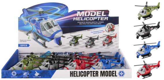 Zalety produktu: Helikopter 13 cm MEGA CREATIVE mix kolorów. Helikopter o długości 13 cm to świetna zabawka dla małych miłośników pojazdów latających. Wykonany z lekkiego i wytrzymałego materiału, doskonale nadaje się do codziennej zabawy. Dostępny w różnych kolorach wysyłka losowa , dzięki czemu każda sztuka to mała niespodzianka. Mały helikopter zapewni dziecku wiele godzin kreatywnej zabawy i stanie się świetnym uzupełnieniem kolekcji pojazdów. Całość wykonana z plastiku. Występuje w czterech kolorach: zielonym, czarnym, czerwonym, niebieskim. Zawartość zestawu: helikopter. Wymiary/waga/baterie: wymiary produktu cm : 13cm, wymiary opakowania-display dł. x wys. x gł. cm : 42x7x27, waga produktu bez opakowania kg : 0,04 kg, waga produktu opakowania-display kg : 0,70kg, nie wymaga zasilania bateriami. Produkt przeznaczony dla dzieci w wieku: 3 . Pakowany w display po 12szt. W kartonie zbiorczym po 144/288 szt.