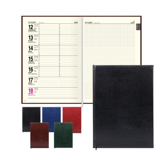 Kalendarz ma 112 strony i twardą, skóropodobną okładkę, która chroni wnętrze przed zniszczeniem, zapewniając jednocześnie elegancki wygląd. Układ środka jest niezwykle funkcjonalny cały tydzień ma swoją stronę, a cała druga strona jest poświęcona na notatki, co ułatwia organizację i planowanie.