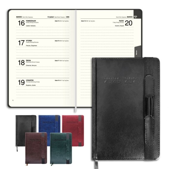 Format A5 i solidna, skóropodobna twarda okładka zapewniają wygodę i trwałość, a gumka z uchwytem na długopis pozwala mieć wszystko, czego potrzebujesz, zawsze pod ręką. Dzięki temu kalendarz staje się nie tylko narzędziem do planowania, ale też nieodzownym elementem codziennej pracy.