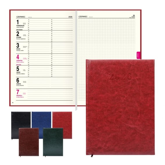 Kalendarz ma 112 strony i twardą, skóropodobną okładkę, która chroni wnętrze przed zniszczeniem, zapewniając jednocześnie elegancki wygląd. Układ środka jest niezwykle funkcjonalny cały tydzień ma swoją stronę, a cała druga strona jest poświęcona na notatki, co ułatwia organizację i planowanie.