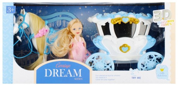 Zalety produktu: kareta posiada efekty świetlne 3D oraz efekty dźwiękowe, ruchome koła, otwierane drzwi, koń posiada długą grzywę i ogon, księżniczka posiada długą balową suknię, zestaw w kolorze niebiesko białym. Kto nie zna historii Kopciuszka? Teraz dzięki zestawowi MEGA CREATIVE z fantazyjną karetą, każdy może się przenieść w podróż na bal Zawartość zestawu: kareta, koń, lalka. Całość wykonana z plastiku, materiału oraz sztucznego włosia. Wymiary/waga/baterie: wymiary produktu dł. x wys. x gł. cm : kareta-18x15x11, koń-17x17x5, wymiary opakowania dł. x wys. x gł. cm : 38x18x12, waga produktu bez opakowania kg : 0,27 kg, waga produktu w opakowaniu kg : 0,51 kg, wymaga zasilania bateriami 3 x AG13-załączono do zestawu. Zestaw przeznaczony dla dzieci w wieku: 3 . Pakowany w kartonik z okienkiem. W kartonie zbiorczym po 12szt.