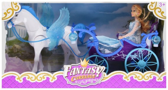 Zalety produktu: Kareta z akcesoriami MEGA CREATIVE światło i dźwięk. Przenieś dziecko w bajkowy świat magicznych podróży Ta piękna kareta w zestawie z konikiem ze skrzydłami, efektami świetlnymi i dźwiękowymi gwarantuje godziny kreatywnej zabawy i rozwijania wyobraźni. Wyrusz w bajkową przygodę i pozwól dziecku stać się bohaterem własnej magicznej historii Wspiera zabawę w odgrywanie ról i tworzenie własnych historii a efekty świetlne i dźwiękowe czynią zabawę jeszcze bardziej realistyczną i atrakcyjną. Całość wykonana z plastiku, materiału oraz sztucznego włosia. Zawartość zestawu: kareta, lalka, koń. Wymiary/waga/baterie: wymiary produktu dł. x wys. x gł. cm : kareta-32x23x17, koń-30x25x8, wymiary opakowania dł. x wys. x gł. cm : 56x31x20, waga produktu bez opakowania kg : 0,99 kg, waga produktu w opakowaniu kg : 1,38 kg, wymaga zasilania bateriami: koń-4xAALR06- nie załączono do zestawu, kareta- 2x AALR6-nie załączono do zestawu. Zestaw przeznaczony dla dzieci w wieku: 3 . Pakowany w kartonik z okienkiem. W kartonie zbiorczym po 6 szt.