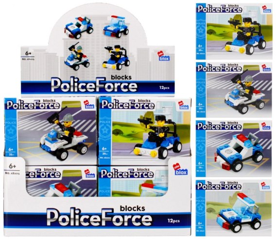 Zalety produktu: klocki zwiększają sprawność umysłową, co przekłada się na kreatywność, pobudzają wyobraźnię oraz pozytywnie wpływają na rozwój dziecka, pojazdy posiadają ruchome elementy, z klocków można zbudować cztery pojazdy policyjne. Komplet klocków konstrukcyjnych ALLEBLOX to nowość w naszej ofercie. Pozwalają na budowanie urozmaiconych konstrukcji, budowli oraz pojazdów, to idealna zabawa zarówno dla małych jak i dużych konstruktorów Łączą się z innymi popularnymi klockami konstrukcyjnymi, są lekkie oraz łatwe do składania. Cała seria klocków zamknięta w jednym displayu. Zawartość zestawu: 12 zestawów klocków od 29 do 39 elementów, instrukcje do składania. Wszystkie elementy wykonane z miękkiego plastiku. Wymiary/waga/baterie: wymiary produktu dł. x wys. gł. cm : wszystkie pojazdy policyjne- 6x3x4, wymiary opakowania 1 szt. dł. x wys. x gł. cm : 10x7x5, wymiary opakowania displaya dł. x wys. x gł. cm : 20x15x14, waga produktów bez opakowania kg : 0,02 kg, waga opakowania 1 szt. kg : 0,03 kg, waga produktu w opakowaniu display kg : 0,48 kg, nie wymagają zasilania bateriami. Produkt przeznaczony dla dzieci w wieku: 6 . Zestaw pakowany w display po 12 szt. http://360.euro-trade.pl/police.html