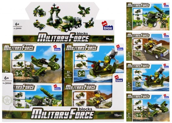 Zalety produktu: klocki zwiększają sprawność umysłową, co przekłada się na kreatywność, pobudzają wyobraźnię oraz pozytywnie wpływają na rozwój dziecka, klocki występują w czterech wzorach: 4 różne pojazdy wojskowe. Komplet klocków konstrukcyjnych ALLEBLOX to nowość w naszej ofercie. Pozwalają na budowanie urozmaiconych konstrukcji, budowli oraz pojazdów, to idealna zabawa zarówno dla małych jak i dużych konstruktorów Łączą się z innymi popularnymi klockami konstrukcyjnymi, są lekkie oraz łatwe do składania. Zawartość zestawu: od 63 do 64 elementów klocków, instrukcja do składania. Wszystkie elementy wykonane z miękkiego plastiku. Wymiary/waga/baterie: wymiary produktu dł. x wys. x gł. cm : 9x6x10, wymiary opakowania dł. x wys. x gł. cm : 15x10x5, waga produktu bez opakowania kg : 0, 03 kg, waga produktu w opakowaniu kg : 0,05 kg, nie wymagają zasilania bateriami. Produkt przeznaczony dla dzieci w wieku: 6 . Pakowany w kartonik w display po 12 szt.