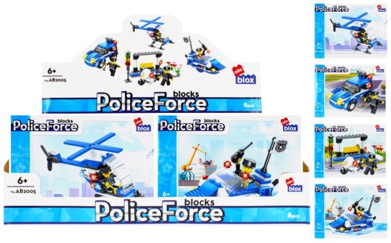Zalety produktu: klocki zwiększają sprawność umysłową, co przekłada się na kreatywność, pobudzają wyobraźnię oraz pozytywnie wpływają na rozwój dziecka, klocki występują w czterech wzorach: Helikopter policyjny, łódka policyjna, auto policyjne, policja na motorze. Komplet klocków konstrukcyjnych ALLEBLOX to nowość w naszej ofercie. Pozwalają na budowanie urozmaiconych konstrukcji, budowli oraz pojazdów, to idealna zabawa zarówno dla małych jak i dużych konstruktorów Łączą się z innymi popularnymi klockami konstrukcyjnymi, są lekkie oraz łatwe do składania. Zawartość zestawu: od 96 do 104 elementów klocków, instrukcja do składania. Wszystkie elementy wykonane z miękkiego plastiku. Wymiary/waga/baterie: wymiary produktu dł. x wys. x gł. cm : helikopter-16x8x6, łódka-12x8x6, auto-9x6x4, policja na motorze-10x9x7, wymiary opakowania dł. x wys. x gł. cm : 19x14x5, waga produktu bez opakowania kg : 0, 04 kg, waga produktu w opakowaniu kg : 0,08 kg, nie wymagają zasilania bateriami. Produkt przeznaczony dla dzieci w wieku: 6 . Pakowany w kartonik w display po 8 szt. http://360.euro-trade.pl/police.html