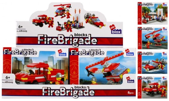 Zalety produktu: klocki zwiększają sprawność umysłową, co przekłada się na kreatywność, pobudzają wyobraźnię oraz pozytywnie wpływają na rozwój dziecka, klocki występują w czterech wzorach: Helikopter strażacki, Poduszkowiec, Wóz strażacki, płonący budynek. Komplet klocków konstrukcyjnych ALLEBLOX to nowość w naszej ofercie. Pozwalają na budowanie urozmaiconych konstrukcji, budowli oraz pojazdów, to idealna zabawa zarówno dla małych jak i dużych konstruktorów Łączą się z innymi popularnymi klockami konstrukcyjnymi, są lekkie oraz łatwe do składania. Zawartość zestawu: od 96 do 104 elementów klocków, instrukcja do składania. Wszystkie elementy wykonane z miękkiego plastiku. Wymiary/waga/baterie: wymiary produktu dł. x wys. x gł. cm : poduszkowiec-12x5x7, wóz strażacki-10x6x4, helikopter-15x7x6,płonący budynek-15x12x7, wymiary opakowania dł. x wys. x gł. cm : 19x14x5, waga produktu bez opakowania kg : 0, 04 kg, waga produktu w opakowaniu kg : 0,08 kg, nie wymagają zasilania bateriami. Produkt przeznaczony dla dzieci w wieku: 6 . Pakowany w kartonik w display po 8 szt. http://360.euro-trade.pl/fire.html