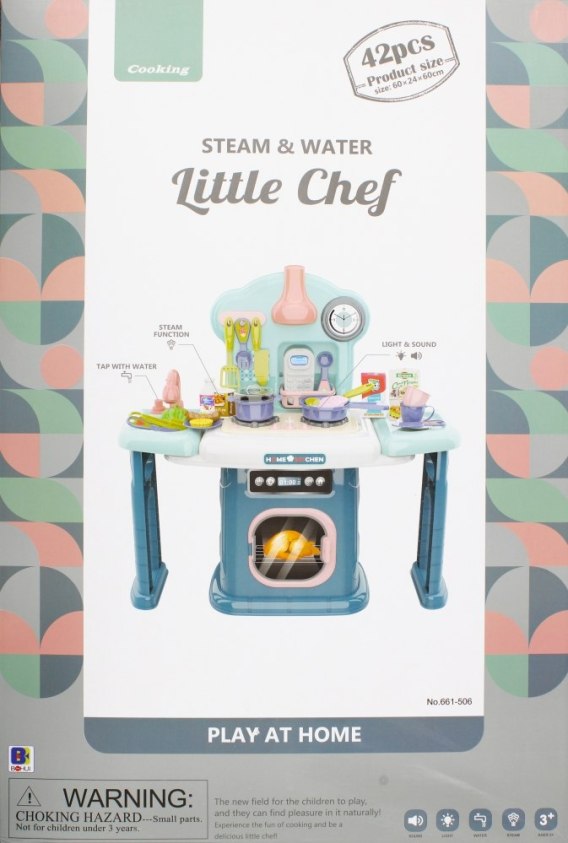 Zalety produktu: posiada efekty dźwiękowe oraz świetlne, płyta wydaje odgłosy gotowania, kurki do sterowania kuchenką są ruchome, zlew posiada kran z którego leje się woda, kuchnia posiada otwierane drzwi piekarnika, składa się z 42 elementów. Kuchnia MEGA CREATIVE to propozycja ciekawej i wciągającej zabawy dla dzieci, które chętnie naśladują zajęcia dorosłych i w bezpieczny sposób mogą bawić się w małych kucharzy. Ciekawy i nowoczesny design, a także ładna i żywa kolorystyka to tylko niektóre cechy tej kuchni Zawartość zestawu: kuchnia, garnek z pokrywką, rondelek, 2 x filiżanki, 2 x talerze, sztućce, łopatka, chochla, szczypce, imitacja jedzenia oraz produktów spożywczych. Całość wykonana z plastiku oraz kartonu. Wymiary/waga/baterie: wymiary produktu dł. x wys. x gł. cm : 60x60x24, wymiary opakowania dł. x wys. x gł. cm : 45x66x10, waga produktu bez opakowania kg : kg, waga produktu w opakowaniu kg : 2,30 kg, wymaga zasilania bateriami 3 x AALR06- nie załączono do zestawu. Zabawka przeznaczona dla dzieci w wieku: 3 . Pakowana w kartonik. W kartonie zbiorczym po 6 szt.