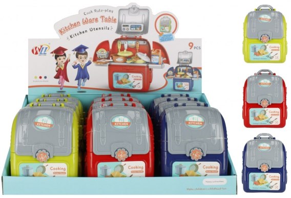 Zalety produktu: rozwija zdolności poznawcze, kreatywność dziecka, zestaw zapakowany w poręcznym plecaczku. Twoje dziecko najlepiej uczy się poprzez zabawę. Zachęcając je do niej, przyczyniasz się do rozwoju jego kreatywności, zmysłów i zdolności poznawczych. Zestaw kuchenny MEGA CREATIVE będzie doskonałym uzupełnieniem każdej dziecięcej kuchni czy sklepu Zestaw występuje w trzech kolorach zielonym, czerwonym, granatowym. Zawartość zestawu: plecak kuchenka ze zlewem, patelnia, chochla, nóż, garnek z pokrywką, 2x podbierak do makaronu, łyżka, talerz, deska do krojenia, pojemnik z płynem do mycia garnków. Wszystkie akcesoria są imitacją prawdziwych produktów. Całość wykonana z plastiku. Wymiary/waga/baterie: wymiary produktu dł. x wys. x gł. cm : 21x23x7, wymiary opakowania display dł. x wys. x gł. cm : 37x14x23, waga produktu bez opakowania kg : 0,10 kg, waga produktu w opakowaniu display kg : 1,12 kg, Zabawka pakowana w displayu po 9 szt. Nie wymaga zasilania bateriami. Zestaw przeznaczony dla dzieci w wieku: 3 . Zestaw pakowany w podręcznym plastikowym plecaczku w displayu po 9szt. W kartonie zbiorczym po 90/180szt.