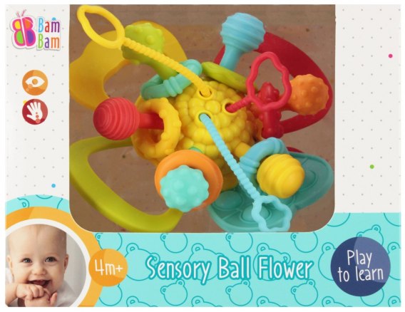 KULA SENSORYCZNA BAM BAM pozwala na doskonalenie umiejętności manualnych i motoryki małego dziecka w pełnym zakresie. Łatwość jej utrzymania w małej dłoni, chwycenia, potrząsania, zginania doskonale mobilizuje dziecko do manewrowania i manipulacji paluszkami, zapewniając mu przy tym długą zabawę. Intensywne kolory wypustek grzechotki stymulują jego percepcję wzrokową, a zróżnicowana tekstura, zmysł dotyku. Zabawka wykonana z najwyższej jakości plastiku oraz gumy bez ftalanów, zgodna z EN-71 i CE zapewnia bezpieczną zabawę. Wymiary/waga/baterie: wymiary produktu dł. x wys. x gł. cm : 14x14x14, wymiary opakowania dł. x wys. x gł. cm : 18x14x14, waga produktu bez opakowania kg : 0,10 kg, waga produktu w opakowaniu kg : 0,20 kg, nie wymaga zasilania bateriami. Zabawka przeznaczona dla dzieci w wieku: 4m . Pakowana w kartonik z okienkiem. W kartonie zbiorczym po 64 szt.