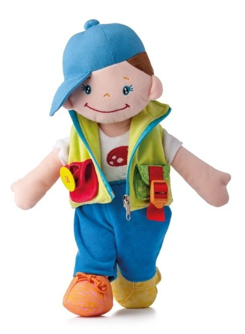 Lalka posiada zdejmowane ubranka, które umożliwiają ćwiczenie ubierania i rozbierania. Rzepy na nóżkach pozwalają na wielokrotny trening zapinania, a duży drewniany guzik wszyty w kieszonkę kamizelki wspiera rozwój precyzji ruchów palców i sprawności manualnej.