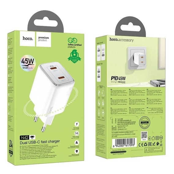 Ładowarka sieciowa Hoco N42 z funkcją szybkiego ładowania i dwoma portami USB-C. Pozwala na błyskawiczne ładowanie urządzeń mobilnych. Została wykonana w technologii GaN.