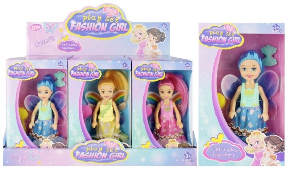 Zalety produktu: lalka ma ruchome ręce i nogi, posiada zdejmowaną bluzkę oraz odpinane kolorowe skrzydła, występuje w trzech wersjach kolorystycznych: różowa, niebieska oraz żółta. Lalka 15 cm od MEGA CREATIVE to niezbędna zabawka w kolekcji każdej młodej damy. Bez wątpienia czas spędzony z nią będzie czystą przyjemnością i fantastyczną zabawą Zawartość zestawu: Lalka, szczotka do włosów. Zabawka wykonana z plastiku, sztucznego włosia oraz materiału. Wszystkie produkty są imitacja prawdziwych. Wymiary/waga/baterie: wymiary produktu dł. x wys. x gł. cm : lalka 15 cm, wymiar opakowania dł. x wys. x gł. cm : 11x18x4, wymiary DISPLAYA dł. x wys. x gł. cm : 34x18x15, waga produktu bez opakowania kg : 0,05 kg, waga produktu w opakowaniu kg : 0,08 kg, waga DISPLAYA kg : 1,08 kg, nie wymaga zasilania bateriami. Zestaw przeznaczony dla dzieci w wieku: 3 . Lalka pakowana w kartonik z okienkiem. W kartonie zbiorczym display po 12 szt.