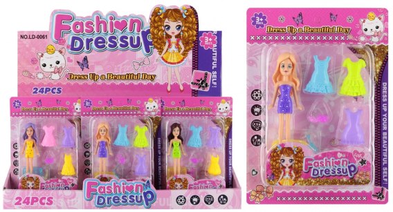 Zalety produktu: rozwija kreatywność dziecka, zabawa lalką przeniesie dziecko w świat mody. Lalka z akcesoriami to wspaniały zestaw. Lalka z dodatkami pozwoli Twojemu dziecku przenieść się w świat lalek wzorowanych na styl lalek Barbie. W jednym opakowaniu mała laleczka z akcesoriami tj: 3 sukienki, torebka. Zestawy występują w trzech wersjach kolorystycznych. Zawartość zestawu: Lalka 8 cm z akcesoriami. Całość wykonana z plastiku. Wymiary/waga/baterie: wymiary produktu cm : lalka 8 cm, wymiary opakowania dł. x wys. x gł. cm : 13x18x3, wymiary displaya dł. x wys. x gł. cm : 38x19x25, waga produktu w opakowaniu kg : 0,03 kg, waga displaya kg : 1,00 kg, nie wymaga zasilania bateriami. Produkt przeznaczony dla dzieci w wieku: 3 . Pakowany na blistrze. Pakowany w display po 24 szt. W kartonie zbiorczym 384 szt.