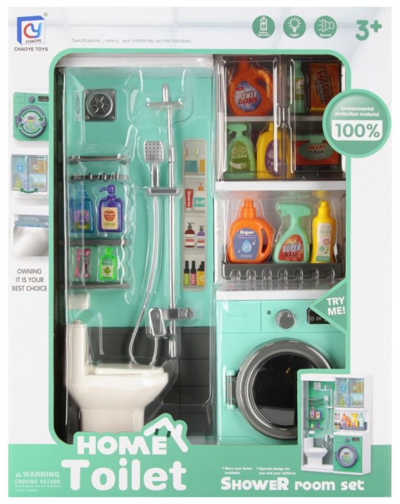 Zalety produktu: zestaw mebli idealnych dla lalek. Niezbędny Zestaw Mebli łazienkowych MEGA CREATIVE do domku dla lalek. Oprócz świetnej zabawy, pomogą rozwinąć umysł dziecka świetna zabawa w dom nauczy twoją pociechę już od wczesnych lat obowiązków domowych. Pralka wydaje efekty świetlne oraz dzwiękowe-odgłos prania, wirowania jak w prawdziwej pralce. Zawartość zestawu: pralka automatyczna z akcesoriami do prania tj. płyn, proszek, toaleta, prysznic z akcesoriami. Całość wykonana z plastiku. Wymiary/waga/baterie: wymiary produktu dł. x wys. x gł. cm : -pralka z szafką 10x32x8, -kabina prysznicowa i toaleta WC 13x32x7, wymiary opakowania dł. x wys. cm :28x36x8, waga produktu bez opakowania kg : 0,55 kg, waga produktu w opakowaniu kg : 0,75 kg, Wymaga zasilania bateriami-pralka 3x AALR06-nie załączonymi do zestawu. Zabawka przeznaczona dla dzieci w wieku: 3 . Pakowanie kartonik z okienkiem. W kartonie po 18/36 szt.