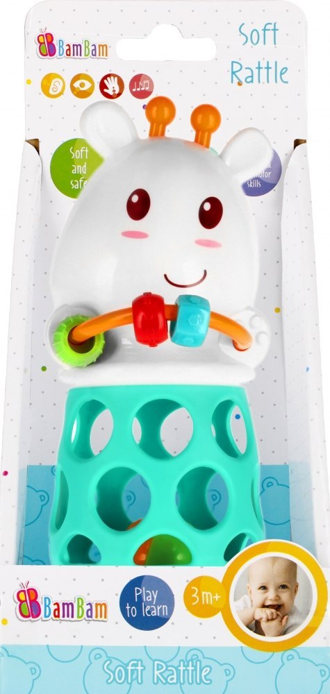 Miękka, Gumowa GRZECHOTKA KRÓWKA zapewni maluszkowi doskonałą rozrywkę oraz zachęci do aktywności. Potrząsanie zabawki wyzwala charakterystyczne dźwięki towarzyszące odbijaniu się kuli o wnętrze zabawki. Poprzez potrząsanie czy zgniatanie grzechotki dziecko rozwija motorykę i zdolności manualne. Uchwyty z pierścieniami i niezwykle barwnymi koralikami o zróżnicowanej teksturze są doskonałe do nauki chwytania i ćwiczenia zdolności manualnych małych rączek. Umożliwiają ćwiczenie koordynacji i przenoszenia przedmiotu z rączki do rączki. Miękki materiał, z jakiego wykonana jest zabawka, z licznymi otworami ułatwia utrzymanie zabawki w małych rączkach. Chroni przed obtarciami paluszki oraz wrażliwe dziąsła. Grzechotka stymuluje rozwój słuchu. Wymiary/waga/baterie: wymiary produktu szer. x wys. cm : 7x16, wymiary opakowania dł. x wys. x gł. cm : 10x23x9, waga produktu bez opakowania kg : 0,11 kg, waga produktu w opakowaniu kg : 0,16 kg, nie wymaga zasilania bateriami. Zabawka przeznaczona dla dzieci w wieku: 3m . Pakowana w otwarty kartonik.