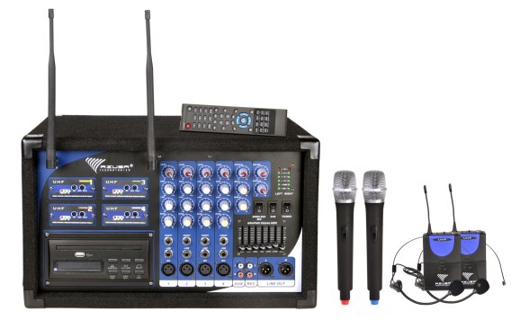 PA-180 posiada wbudowany odbiornik bezprzewodowy UHF działający w zakresie 614 MHz - 694 MHz, co zapewnia wysoką stabilność połączenia. Dodatkowo, zestaw jest wyposażony w wymienialny odtwarzacz DVD/CD/CD+G z czytnikiem USB, który pozwala na odtwarzanie różnorodnych mediów. Wskaźnik LED oraz funkcja master EQ umożliwiają precyzyjne zarządzanie dźwiękiem, co jest kluczowe podczas występów na żywo.