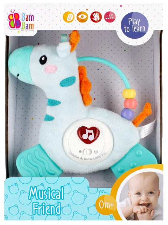 Interaktywna Muzyczna Żyrafka to zabawka spełniająca aż 4 funkcję- przywieszki, maskotki, gryzaka oraz pozytywki, na każdy etap rozwoju dziecka. Zróżnicowana faktura i materiały, w tym ruchome elementy oraz mrugające przyciski, wygrywające melodie, dostarczają szeregu bodźców, aktywizując wszechstronny rozwój dziecka, począwszy od zmysłów poprzez zdolności manualne, motoryczne oraz percepcję i wyobraźnię.  Na półokręgu na grzbiecie zebry nawleczone są 4 kolorowe kółeczka, ktore przy potrząsaniu wydają delikatne, grzechoczące dźwięki.  Dodatkowo w zestawie znajduje się okrąg, dzięki któremu można zawiesić zabawkę na ramie łóżka. Wymiary/waga/baterie: wymiary produktu dł. x wys. x gł. cm : 17x19x4, wymiary opakowania dł. x wys. x gł. cm : 18x25x8, waga produktu bez opakowania kg : 0,10 kg, waga produktu w opakowaniu kg : 0,25 kg. Zabawka przeznaczona dla dzieci w wieku: 0 m-ca. Wymaga zasilania bateriami 3 x AG13LR44- załączno do zestawu. Zestaw pakowany w kartonik z okienkiem.