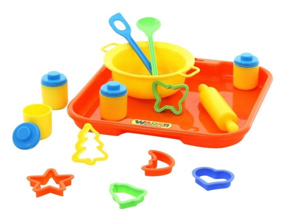 "Piknik, podwieczorek, obiad, kolacja i każdy inny poczęstunek. Okazuje się, że lalki i pluszaki naszych pociech spożywają niezliczoną ilość posiłków w ciągu dnia. My możemy urozmaicić zabawę dając naszym dzieciom w prezencie zestaw naczyń NR 1 Z TACĄ od firmy POLESIE WADER. To specjalny komplet naczyń i akcesoriów do pieczenia ciast i ciasteczek. W skład zestawu wchodzą: cztery małe pojemniki z wiekami, dwie duże łyżki do mieszania, garnek, wałek, foremki oraz duża taca. Jakość zastosowanego plastiku gwarantuje trwałość i bezpieczeństwo w użytkowaniu produktu."