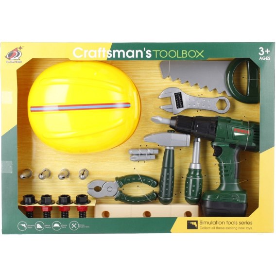 Zalety produktu: rozwija kreatywność dziecka, poznaje podstawowe narzędzia warsztatowe, wkrętarka po uruchomieniu obraca wiertłem wydając odgłos wkręcania. Zestaw narzędzi MEGA CREATIVE to podstawowy element wyposażenia małego majsterkowicza. Dzięki niemu każde dziecko nauczy się jak przykręcać śrubki czy poprawnie używać wiertarki Interakcja rodzic-dziecko pobaw się i spędź czas ze swoim dzieckiem Zawartość zestawu: kask, wkrętarka, piła ręczna, klucz nasadowy, młotek, śrubokręt, kombinerki, deseczka do wkręcania śrubek, śrubki oraz nakrętki, 2 końcówki do wkrętarki. Wymiary/waga/baterie: wymiary produktu dł. x wys. x gł. cm : wkrętarki-23x19x5, kask- 19x11x25, wymiary opakowania dł. x wys. x gł. cm : 51x36x7, waga produktu bez opakowania kg : 0,58 kg, waga produktu w opakowaniu kg : 0,94 kg, wymaga zasilania bateriami 2 x AALR06- nie załączono do zestawu. Zestaw przeznaczony dla dzieci w wieku: 3 . Pakowany w kartonik z okienkiem. W kartonie zbiorczym po 10 szt.