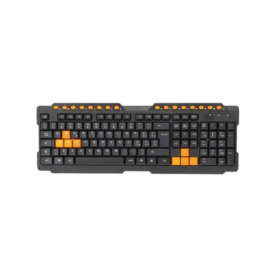 Multimedialna klawiatura przewodowa w kolorze czarnym z pomarańczowymi przyciskami funkcyjnymi.