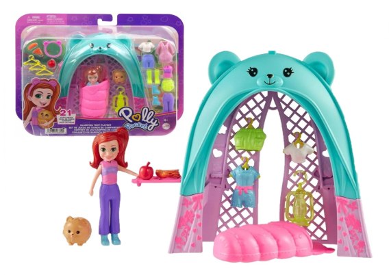 Polly Pocket wybiera się na glamping Zestaw z misiowym namiotem zawiera lalkę, figurkę zwierzątka i akcesoria. Rozbij namiot wraz ze zwierzaczkiem i ułóż lalkę w śpiworze – ale tu wygodnie Biwakowanie jeszcze nigdy nie było tak stylowe W namiocie możesz rozwieszać ubranka i bawić się w przebieranki. Rozłóż tackę na „jedzenie”, aby cieszyć się pysznym posiłkiem pod gwiazdami Możesz zebrać też inne zestawy glampingowe Polly Pocket i zorganizować niezapomnianą wyprawę na łono natury. Wspaniały prezent dla fanów Polly Pocket w wieku od 4 lat, zwłaszcza tych, którzy uwielbiają wypady na kemping. Sprzedawane zależnie od dostępności. Kolory i elementy dekoracyjne mogą się różnić.